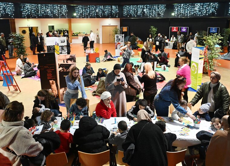 Ayden, 17 mois, ne sait plus où donner de la tête et du regard dans la grande salle de l’espace Jean-Ferrat transformée en bibliothèque géante, ce mardi 18 novembre, à l’occasion du grand forum consacré à la lecture organisé dans le cadre du dispositif « Éduquer Ensemble », pilier du « Projet éducatif local ».