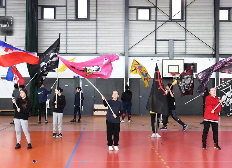 Le rythme est soutenu en cette fin de matinée de mercredi pour les 4e1 de Romain- Rolland. Dans le cocon du gymnase Cerdan, à deux pas de leur collège, les élèves de Stéphanie Carayon-Pina marchent en effet en cadence sur un morceau électro, drapeaux colorés à bout de bras. Ils sont en pleine répétition de la Grande Parade imaginée par le Théâtre Louis-Aragon et la compagnie La Grive pour l’Olympiade culturelle qui accompagne chaque Jeux Olympiques et Paralympiques.