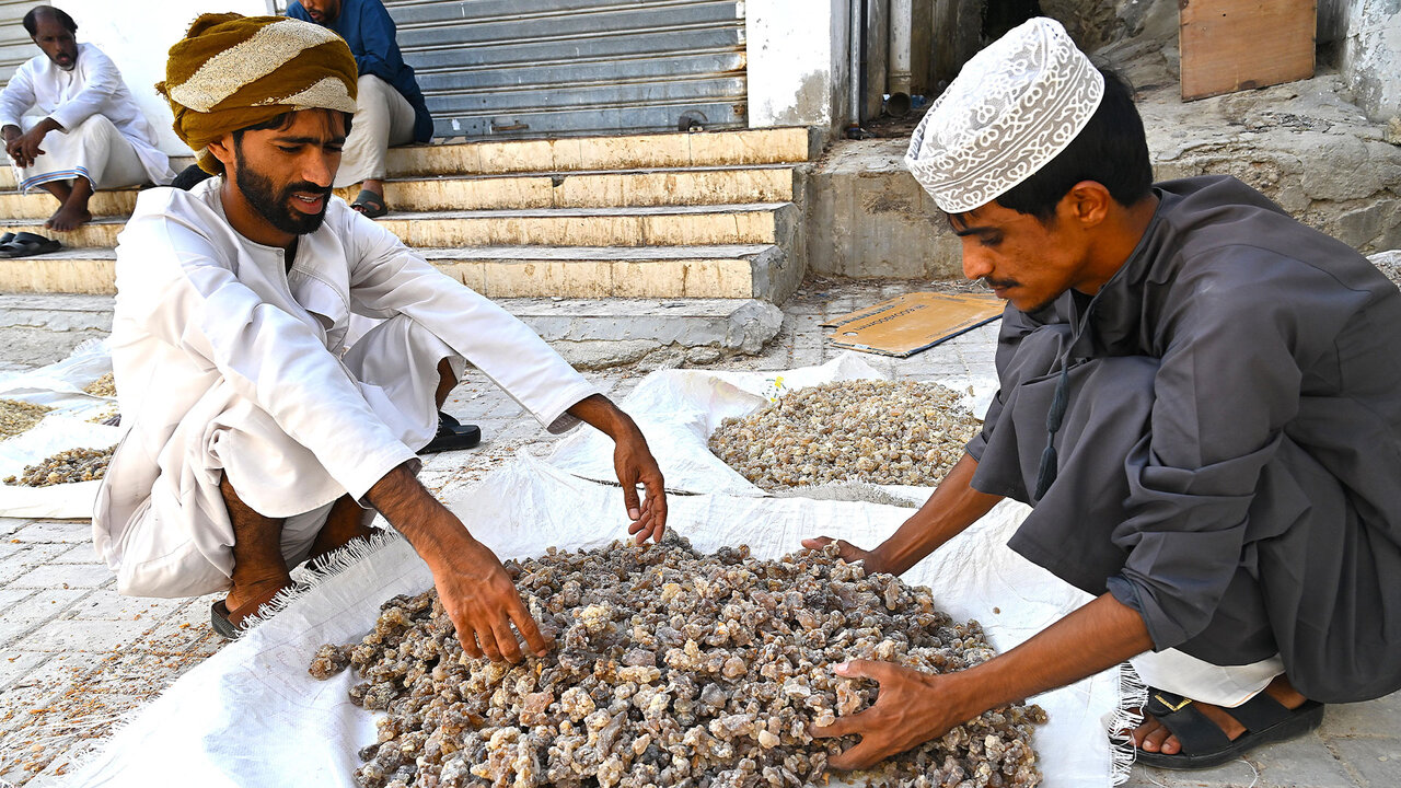 À proximité du souk, localement surnommé Al Dahlam ("le marché des ténèbres"), des hommes enturbannés accroupis sur le sol devant une bâche trient des morceaux de luban et de myrrhe, emplissant des sacs en plastique sur une petite balance. Ce parfum solide se retrouve aussitôt sur les étals des commerçants alentours. Un rituel aussi vieux que la ville. Les marchands aiment raconter que Marco Polo lui-même évoquait déjà cet “or parfumé” venu des montagnes du Dhofar. Oman possède manifestement son identité olfactive.
